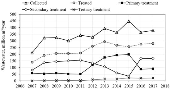 Collected and treated wastewaters in Croatia, 2007–2017. Data from [36].