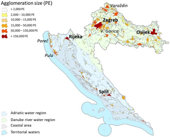 The ongoing upgrades of the public wastewater system include all larger cities and industrial areas. In Croatia, 91 agglomerations have wastewater loads larger than 10,000 PE while another 190 agglomerations have wastewater loads in the range between 2000 and 10,000 PE. Following EU directives, secondary wastewater treatment is mandatory to agglomerations larger than 10,000 PE. Furthermore, agglomerations located within ecologically sensitive areas must implement tertiary wastewater treatment, including nitrogen and phosphorus removal. In Croatia, the ecologically sensitive areas are located in the drainage basins of Danube River and Adriatic Sea (Table 2) [37].
