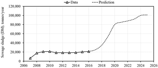 Quantity of sewage sludge produced in Croatia, data for 2007–2016 and predictions to 2025. Data from [35].