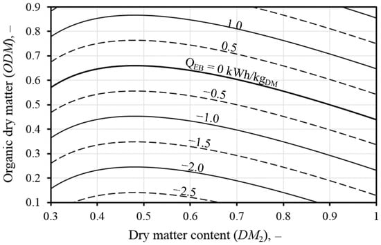 Figure 6 depicts the energy balance with respect to the ODM and DM2 values, assuming an energy recovery efficiency of η = 0.8 and an initial dry matter content of DM1 = 0.3. It can be seen that the energy balance is negative for sewage sludges with organic matter contents lower than ODM < 0.44, regardless of the dry matter content after thermal drying (DM2). This is the case for digested sewage sludge with low heating values (LHV < 2.6 kWh/kgDM).