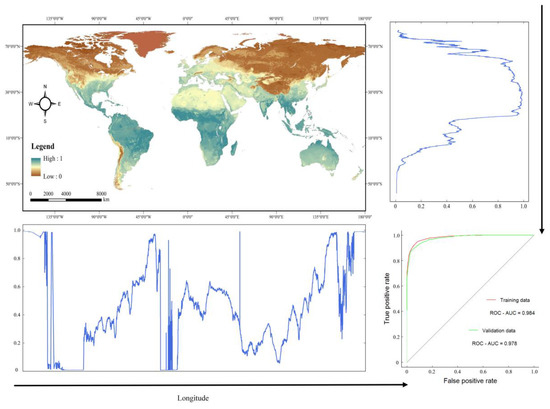 Figure 2 also shows that the BRT model applied to training samples and validation samples achieved high predictive performance, with AUC values of 0.984 and 0.978, respectively. The spatial distribution of the validation samples illustrates that sweet sorghum has a wide geographic distribution, mainly concentrated in India and central and southern Africa (Figure 3). Compared with the above two areas, the distribution of validation samples in the remainder of the regions was relatively scattered. The results also reveal that the predicted distribution of sweet sorghum covered the area of the validation samples well. This map reflects the potential land resources for sweet sorghum growth.