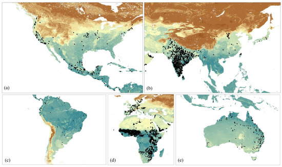 Spatial distribution of the validation samples with 1513 occurrence units: (a) North America; (b) Asia; (c) South America; (d) Africa and Europe; (e) Oceania.