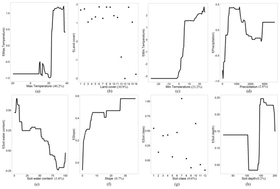 Relative contribution of environmental factors predicting the global distribution of sweet sorghum: (a) annual maximum temperature; (b) land cover; (c) annual minimum temperature; (d) mean annual precipitation; (e) soil water content; (f) slope; (g) soil class; (h) effective soil depth.