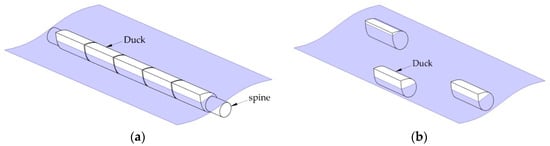 The Duck WEC was evolved from flapping devices []. It is sophistically designed and reached a 92% hydrodynamic efficiency in regular wave tests []. Extensive experiments were performed during 1975–1980 to study the performance of the Duck with axis compliant [], torque limit [] and slamming [], etc. Evans proposed a two-dimension (2D) theoretical method based on the proportion of reflected and transmitted wave power, and showed that a 100% hydrodynamic efficiency is possible for the asymmetrical Salter’s cam shape []. Mynett et al. proposed a 2D numerical study of the Duck based on linear theory of surface waves and floating bodies interaction, and the hydrodynamic efficiency and response are presented with the rotation axis rigidly or non-rigidly supported, respectively []. Nebel used a complex-conjugate synthesizer in both theoretical and experimental studies to predict the hydrodynamic performance of the Duck WEC, and reached a higher hydrodynamic efficiency over a broader bandwidth than previously achieved []. Above studies are focused on the spine-connected Duck configurationas shown in Figure 1a. The solo Duck configuration is able to use the point absorber effect to further enhance its power capture performance [], as shown in Figure 1b. Pizer proposed a three-dimensional linear wave-diffraction numerical model to predict the hydrodynamic performance of a solo Duck, and found good agreement with both analytical and theoretical results in the linear wave regime, but also showed a variety of unexpected singularities in the damping matrix []. Cruz and Salter proposed a solo circular cylinder for desalination purpose with an offset pitching axis without the front beak to replace the original shape of the Duck to reduce cost, and the influence of the axis position was evaluated to find the optimal configuration for this kind of WEC [,]. Lucas et al. used a simplified one degree-of-freedom frequency-domain model with linear damping loads to optimize the performance of a solo circular cylinder, and showed that for a particular wave climate the optimal performance of the WEC can be acquired by relocating the ballast [].