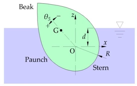 The geometry of the cross section of the solo Duck is shown in Figure 2. The cross section is composed of the paunch, stern and beak parts, and rotates about the axis O. The stern part is of circular shape with O as its center point, so that the pitch motion does not radiate waves afterward, R denotes the radius of the stern part, G denotes the mass center, θ5 denotes the pitch angular displacement of the mass center with the counterclockwise direction as positive, and d denotes the depth of the rotation axis. Oxyz is the Cartesian coordinate system with x in the incident wave propagating direction, y in the longitudinal direction of the Duck, z in the opposite direction of the gravity acceleration, and z-x plane locating at the middle cross section of the Duck along the longitudinal direction.