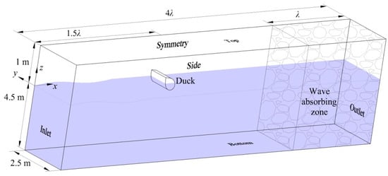 Since the solo Duck is symmetrical relative to the z-x plane, only half of the Duck is modeled to reduce the computational cost. The geometry of the numerical wave tank is shown in Figure 3. The length of the NWT is 4λ, where λ is wavelength of the incident wave, and is chosen as a result of the balance between results’ stability and computational cost. The width and water depth of the NWT is the same as the experimental setup, and is 2.5 m and 4.5 m, respectively. Since the Duck WEC is of water surface piercing type, the hydrodynamic simulation of the Duck WEC is a two-phase flow problem. Therefore, another 1 m depth above the z = 0 plane is reserved for the air phase. The wave is generated at the inlet boundary, and absorbed in the wave absorbing zone, which lasts one wavelength as [] suggests to avoid wave reflection. The Duck is placed 1.5λ away from the inlet boundary.