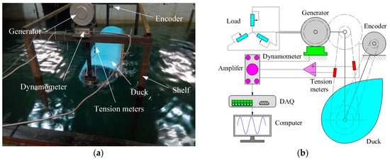 The configuration of the experimental setup is shown in Figure 5a,b. A low speed disk-type permanent magnet generator, which is often used in small wind turbines, is used as the PTO system, and it is connected to the rotation axis of the Duck by cascaded synchronizing wheels and gears to increase speed. The speed-up system will drive the generator out of the non-linear speed zone, where the output voltage is not proportional to the input rotation speed, so that the linear damping assumption in numerical simulations will be more credible. The load of the PTO system consists of symmetric three phase resistors, and the resistors are adjustable to find optimal damping coefficient for power absorption. The torque transferred by the synchronizing belt is measured by a pair of tension meters, which are embedded into the synchronizing belt on both sides. The torque can be determined by the output voltage difference between the two meters firstly multiplied by a factor, which is obtained by the multiplication of the amplification coefficient of the mechanical and electrical systems, and secondly multiplied by the radius of the synchronizing wheel. The synchronizing belt and tension meters are pre-tensioned to avoid force impact if the belt is suddenly tensioned from the slacked state. The pitch angular displacement of the Duck is measured by an encoder connected to the rotation axis of the Duck on the other side also by a synchronizing belt. A Kistler 9257B three components dynamometer is used to measure the hydrodynamic forces in surge and heave directions. It is fixed on one side of the rotation axis supporting system assuming that the hydrodynamic forces are distributed symmetrically relative to the middle section of the Duck. Output voltage signals of the all these transducers are imported to a data acquisition (DAQ) card, which transfers analog signals to digital signals, and then the output of DAQ card is transferred to a computer, where data is stored and analyzed.