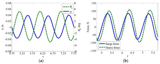 Measured free surface elevation at the Duck position with the Duck be removed from the NWT and hydrodynamic responses of the Duck at T = 1.6 s and H = 0.075 m: (a) measured free surface elevation and pitch angular displacement of the Duck; (b) surge and heave hydrodynamic forces applied on the Duck.