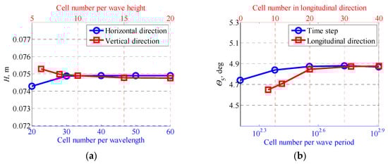 Figure 7 shows the convergence study results at T = 1.6 s and H = 0.075 m. Figure 7a shows the measured wave height as a function of the cell number per wavelength and per wave height. The wave height tends to be stable when the cell number per wavelength and per wave height exceeds 30 and 10, respectively. Figure 7b shows the pitch angular displacement amplitude as a function of the cell number in the longitudinal direction and per wave period. Also, it reveals that when the cell number in the longitudinal direction and per wave period exceeds 32 and 360, respectively, the angular displacement amplitude tends to converge. Therefore, for a tradeoff betweenthe computational costand the accuracy, for later simulations in this paper, the mesh resolution and time step are set according to the critical cell number stated above.