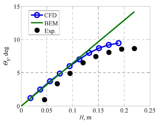 Table 2 shows the test cases for the comparison in different wave heights. Figure 8 shows the comparison of the pitch angular displacement amplitude as a function of wave height among CFD, BEM and experimental results at T = 1.6 s. In Table 2, the difference of the wave height between the CFD and experimental model is due to the measured wave height at the position of the Duck being different from the set value at the wave maker. For example, if the set value of the wave height at the wave maker is 1.0 cm, the measured value of the wave height at the position of the Duck may be smaller than 1.0 cm. The reason behind this phenomenon is that the wave energy is dissipated during the propagation process. Since the dissipation rate of the wave energy may be different between the CFD and experimental model, the measured wave height at the position of the Duck may also be different, e.g., 0.9 cm for the CFD model and 0.8 cm for the experimental model. Therefore, the expectation of realizing an identical value of the wave height at the position of the Duck for both the CFD and experimental models cannot be easily achieved, but needs time-consuming tuning of the set value of the wave height at the wave maker for both models. Besides, since the wave height is served as the independent variable in Figure 8, whether or not the wave height in the CFD and experimental model is the same does not influence the variation tendency of the dependent variable. Therefore, the wave height between the CFD and experimental model needs not to be the same. The maximum of the wave height in the CFD model is larger than that of the experimental model due to capsizing of the Duck. Due to friction, the motion response of the Duck in the experimental model is slightly smaller than that in the CFD model. Therefore, the Duck in the experimental model is harder to capsize. Meanwhile, the maximum wave height in both models is the minimum wave height that induces the Duck to capsize. Therefore, the maximum of the wave height in the experimental model is larger than the CFD model.