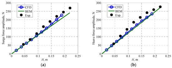 Comparison of the hydrodynamic force amplitude as a function of wave height at T = 1.6 s: (a) surge force; (b) heave force.