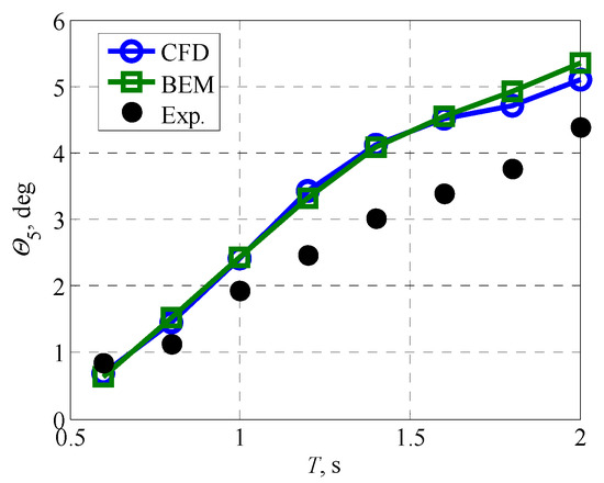 Comparison of pitch angular displacement amplitude as a function of wave period between CFD, BEM and experimental results at H = 0.075 m.