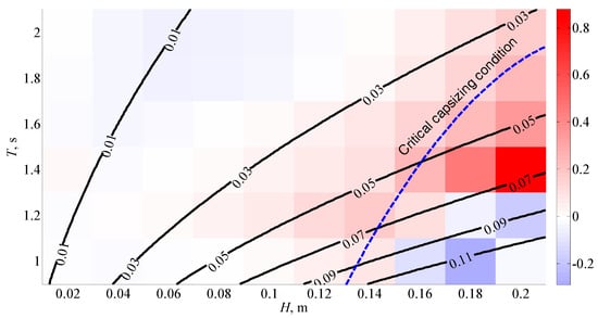 Relative difference of the pitch angular displacement amplitude as a function ofwave height and wave period. Contour lines of the wave steepness are shown by solid lines, while the critical capsizing condition for the Duck is shown by the dashed line.