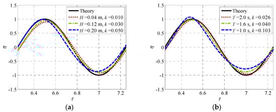 Non-dimensional free surface elevation as a function of the non-dimensional flow time at different wave steepness: (a) at T = 1.6 s; (b) at H = 0.16 m.