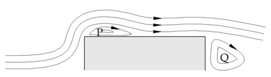 In the above section, we inferred that one of the hydrodynamic nonlinear factors is from the Duck motion, which is mainly embodied by the vortex generation phenomenon around the Duck, especially at the end the Duck. In this section, we try to study the vortex generation process around the WEC using the validated CFD model. For the solo Duck WEC, the vortex generation process is a new challenge since it does not appear for the spine-connected Duck since there are almost no gaps between the Ducks. The pressure difference between the blocked flow in the front area of the Duck and free flow at the end causes vortexes to be generated, which is also very common in aerodynamic design of airplane wings [] and wind turbine blades [], where blade tip losses are caused by pressure differences. The flow passing the end of a Duck is similar to a steady flow passing an obstacle with leading and trailing rectangular corners, as shown in Figure 14. In the upstream, the blockage of the obstacle causes a vertical velocity component of the flow in the front area of the obstacle. At the leading corner, the sharply deceleration of the vertical velocity in the vertical wall boundary layer causes an advert pressure gradient leading to flow separation. Under the compression of the main stream, the separation zone is restricted to a limited zone, and reattachment of the boundary layer happens when the horizontal wall is suitably long. At the trailing corner, the same phenomenon appears since the horizontal boundary layer reaches another corner, and this will cause another flow separation. In both the upstream and downstream positions, standing vortexes are generated and denoted as P and Q, respectively. Because a rectangular angle is the infinite approximation of a sufficiently large curvature, the leading and trailing corners act as the fixed flow separation points for the geometry. These vortex generation phenomena are extensively studied in [,,,]. The direction of P and Q is perpendicular to plane of the main flow with the polarity be determined so that the peripheral velocity of the vortex follows the main flow.
