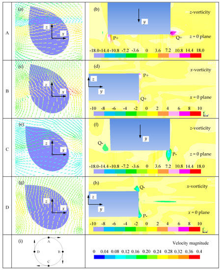 At time instance B, the main flow is in the y-z plane, i.e., x = 0. Similar to the above principle, the P and Q vortexes are generated and both in the positive x direction as confirmed in Figure 15d. At time instance C, the situation is rightly opposite to time instance A. The location of P and Q vortexes are reversed, and both are in the negative z direction as shown in Figure 15f. At time instance D, both location and direction of P and Q vortexes are reversed from time instance B as confirmed in Figure 15h.