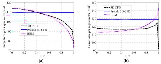 Comparison of hydrodynamic forces per square meter along longitudinal direction of the Duck among 3D CFD, pseudo 3D CFD and BEM results at t = 8.544 s when T = 1.6 s and H = 0.075 m: (a) surge force; (b) heave force.