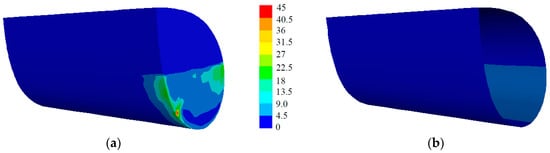Comparison of dynamic pressure contour between 3D CFD and pseudo 3D CFD simulations at t = 8.544 s, when T = 1.6 s and H = 0.075 m: (a) 3D CFD; (b) pseudo 3D CFD.