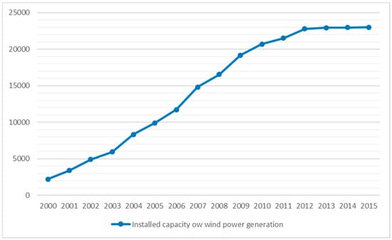 Installed capacity of wind power generation in Spain (2000–2015, TWh). Source: European Commission.
