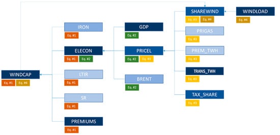 Finally, Equation (4) is a fourth-level equation which explains the evolution of the share of wind energy in the electricity mix (SHAREWIND). This variable depends on the capacity load of wind (WINDLOAD), which in turn depends on the meteorological conditions in a given year and on the installed wind capacity itself (WINDCAP). Therefore, Equation (4) can be specified as follows: