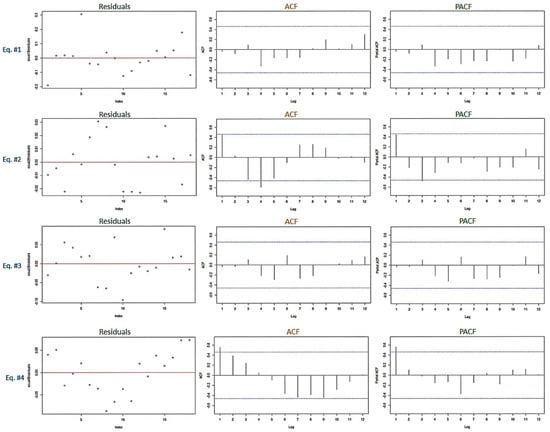 On the other hand, and given that the variables included in the model are integrated of first-order, we have applied the stationarity tests of Augmented-Dickey-Fuller (ADF) to the series of errors of each of the equations, whereas for the usual critical values, the result is that those series are stationary in all the equations; the opposite occurs if the values proposed by [] MacKinnon (1996) are taken as critical values: ADF value of −4.42 against a critical value of −5.16 in the first equation, −3.61 versus −4.28 in the second one, in the third equation an ADF value of −4.19 against −5.16 and finally, −1.69 versus −3.807 in the fourth equation. Notwithstanding, we have taken into account two fundamental reasons for maintaining the specification of the equations. First, the strong support of the economic theory underlying the revised literature in terms of the results obtained. And, secondly, the analysis of the series and functions of total autocorrelation (ACF) and partial autocorrelation (PACF) of the residuals of the estimated equations by OLS that, as can be observed in Figure 3, they point in general to a stationary behavior of these and, therefore, to a stable relationship between the specified variables in each equation.