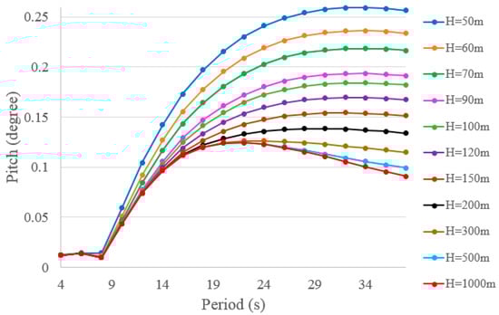 As mentioned earlier, the majority of existing and planned offshore wind projects in the UK are or will be located in nearshore shallow water. For example, the 4.8 GW Dogger Bank, one of the largest offshore wind projects in the UK, will be built in water of depth ranging from 18 m to 63 m [13,14]. However, the authors’ preliminary research has shown that it is more difficult to achieve a stable floating wind turbine in shallow water than in deep water [14]. This can be inferred from the results shown in Figure 1, where H refers to water depth, the x-axis is wave period, and the y-axis is the pitch motion of a floating turbine.