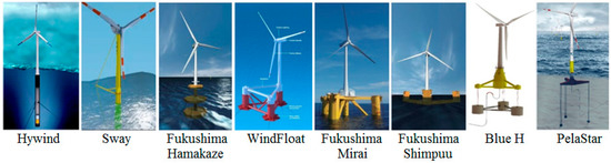 From Figure 1, it is seen that pitch motion, which may have a big influence on the power generation efficiency of a floating wind turbine, increases with decreasing water depth H. This partially explains why the majority of existing floating wind turbines were erected or are planned to be erected in deep water rather than in shallow water. Some of these existing floating turbines are illustrated in Figure 2 and briefly reviewed in Table 1.