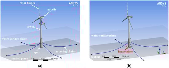 Based on the turbine parameters listed in Table 2, the numerical model of the floating turbine was developed in ANSYS Fluent. The rotating blades were modelled by establishing an additional rotating domain in the large domain already defined. In the rotating domain, the blades were defined as moving walls. Then the rotating speed of the blades is defined by setting the rotational speed of the moving walls. Once the wind load acting on the rotating blades is obtained in ANSYS Fluent, it is imported into ANSYS AQWA for calculating the motions of the floating turbine before and after using the motion stabilizers. In numerical tests, three different sizes of four-wing stabilizers were developed in ANSYS AQWA. The radius of the heave plates used in the three stabilizers is R = 7, 9, and 11 m, respectively. Considering a single heave plate was tried previously [29] to limit the heave motion of spar-supported wind turbines, the numerical model of the spar-supported turbine that is equipped with a single heave plate was developed as well for comparison. The radius of the single heave plate R = 14 m. The wind turbine models used in the numerical tests are illustrated in Figure 4.