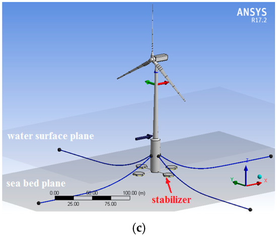 However, the early testing results has shown that the motions of the turbine were dominated mainly by waves. The effectiveness of the proposed concept stabilizer on overcoming the influences of inconsistent wind and tidal current loads cannot be successfully exhibited due to the small wind and tidal current speeds as well as the slim blade and tower structures of the turbine. For this reason, an “amplified” wind turbine, with “wide” blades, “bulky” tower and “larger” floating foundation, was made again in the laboratory in order to investigate the effectiveness of the proposed concept stabilizer under various combined wind, wave, and tidal current loading conditions. The “amplified” turbine is illustrated in Figure 8.