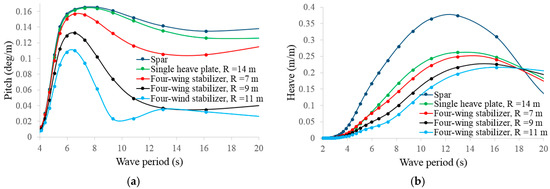 Since the mean wave period is 15–20 s in extreme weather conditions in the North Sea [13], a constant water depth 50 m and wave period increasing from 4 to 20 s were considered in the numerical calculations, so that the motion stabilization capability of the new concept stabilizer can be tested over a wide range of wave period. Since the drag coefficient of heave plates has been found to have a significant influence on the response of floating structures [31], its value in the simulation calculations was carefully selected. In theory, the for a flat disc normal to a steady flow at high Reynolds number is 1.17. But the for an oscillating disc is much larger in value. Therefore, the value of was set to be 1.2 in the present simulation calculations, although its value may reach 2.0–3.5 in laboratory tests [32]. The calculation results obtained in different scenarios are shown in Figure 5. Here, the pitch and heave motions of the floating turbine are shown, as the motions in these two directions have important influences on the safety and power generation efficiency of the turbine.