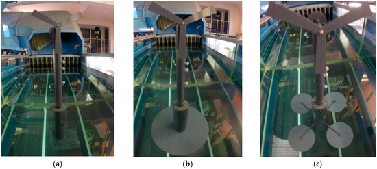“Amplified” turbine used in experimental tests—(a) without using a stabilizer; (b) using a single plate; and (c) using a four-wing stabilizer.