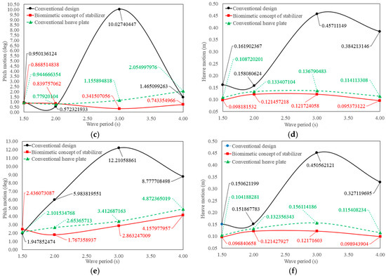 Then, the turbine was tested respectively before and after it was equipped with the stabilizers. The pitch and heave motions of the turbine, which are measured under different loading conditions, are shown in Figure 9.