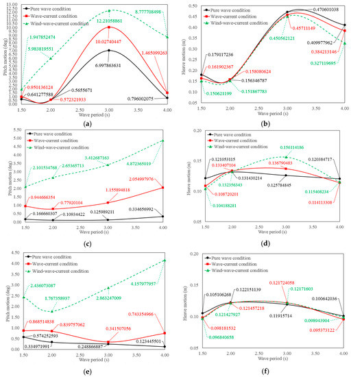 Measured pitch and heave motions of the floating wind turbine. (a) Pitch under pure wave conditions; (b) heave under pure wave conditions; (c) pitch under wave–current conditions; (d) heave under wave–current conditions; (e) pitch under wind–wave–current conditions; and (f) heave under wind–wave–current conditions.