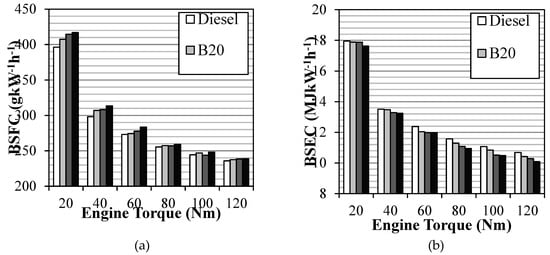 (a) BSFC and (b) BSEC for the tested fuels at different engine loads.