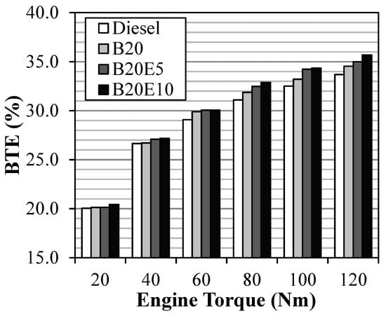 As shown in Figure 3 is the BTE for all the tested fuels under various engine load conditions. Generally, the results showed that the BTE increased with the increment in engine load. Also, the results indicated that the BTE of all blended fuels was consistently improved over the baseline diesel across all engine loads. For instance, the addition of 5% and 10% of bioethanol in the biodiesel-diesel fuel blend have each given a rise to the BTE by 0.4–5.3% and 1.9–5.9% respectively, with respect to baseline diesel. This trend can be attributed to the relatively lower viscosity of the bioethanol as explained in the aforementioned observation of BSEC result, thereby allowing a more complete mixing of air and fuel [51]. Similar observations were also recorded by other researchers. Imdadul et al. [52] and Anand et al. [53] observed that the ternary fuel blends (biodiesel, diesel, and alcohol) showed improved BTE over the binary blends of biodiesel-diesel and this phenomenon can be associated with the improvement in fuel properties. Another explanation is due to the improvements which related to the presence of rich oxygen molecules in the fuel blends of B20, B20E5 and B20E10 [54]. This characteristic will promote more complete combustion in the engine, thereby increasing the BTE. In addition, the results also reveal that the variations in BTE are very similar with the variation in BSEC, where the B20E10 fuel blend recorded the lowest energy consumption, thereby it had the greatest thermal efficiency.
