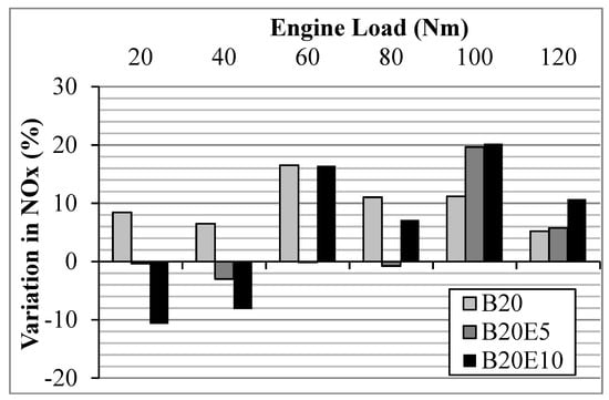 At low engine load conditions, the addition of 5% and 10% of bioethanol in the blends indicated a drop in NOx emission by 0.3–3.0% and 8.1–10.7%, respectively. This phenomenon is mostly related to the evaporative cooling effect of the bioethanol, whereby the relatively lower calorific value and higher latent heat of vaporization [57] contributed to the drop of combustion temperature, hence reducing the NOx formation [58]. At medium engine load, there is no significant difference of NOx variation for B20E5 blend. Meanwhile, higher NOx emissions are produced by B20E5 and B20E10 at high engine load operations. This phenomenon can be associated to the higher oxygen content in bioethanol fuel, which therefore enhanced the NOx formation [59,60].