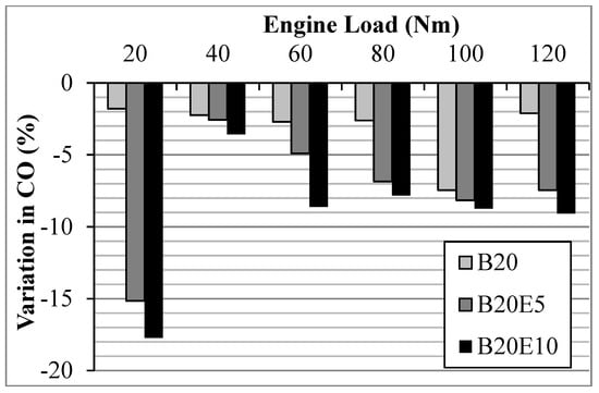 The exhaust emission of CO comes from the incomplete oxidation of the carbon particles in the fuel as a result of inadequate amount of oxygen for the complete oxidation [63]. The variation in CO emission with the oxygenated fuel blends compared to baseline diesel fuel is shown in Figure 5. Generally, the baseline diesel indicated the greatest emission of CO among all the tested fuel blends across all engine load conditions. The results showed that there were average reductions in CO emissions for B20, B20E5, and B20E10 of 3.2%, 7.5%, and 9.3%, respectively. The oxygenated fuel property of the coconut biodiesel and bioethanol-biodiesel blends was claimed to be the main reason for this situation, due to the more complete combustion process that occurred [64,65].