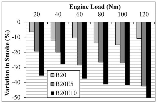Smoke is generated from the incomplete combustion process in the CI engine, and it is definitely undesirable exhaust emission [66]. Figure 6 represents the variation in smoke emission in the form of percentage difference as compared with the baseline diesel at various engine loads. Based on the results obtained, all fuel blends tested showed a significant reduction in smoke emission across all engine loads. This is mainly due to the fact that bioethanol has less carbon and more oxygen than baseline diesel, promoting an increase of the oxygen/fuel ratio and, consequently, improving the combustion process and resulting in lower CO emissions [67]. Also, the rich fuel-borne oxygen content in biodiesel and bioethanol blends promoted the oxidation of carbon atoms during the combustion process as reported in the literature [68,69,70]. Besides, the result also reveals that the variation of percentage difference in smoke is more prominent and higher with the increases in bioethanol concentration in the blend under all loading conditions. For instance, the percentage reductions of smoke for B20, B20E5, and B20E10 are 11%, 42%, and 52%, respectively as compared to baseline diesel at high engine load of 120 Nm. In general, the blending of bioethanol with the biodiesel-diesel mixture favoured noticeably improved smoke emissions.