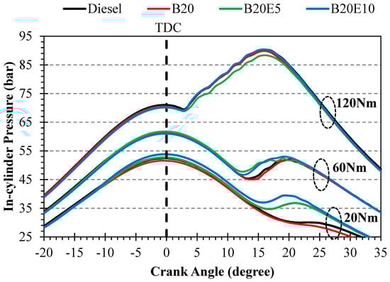 The variation in combustion pressure for diesel, B20 and B20E5 at an engine load of 20 Nm, 60 Nm, and 120 Nm.