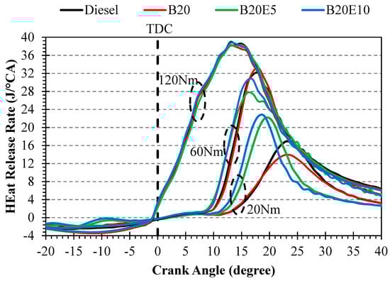 The variation in heat release rate for diesel, B20 and B20E5 at an engine load of 20 Nm, 60 Nm, and 120 Nm.