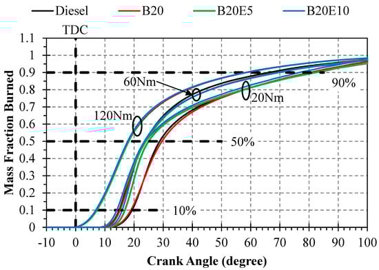 Variation in mass fraction burned for all tested fuels at an engine load of 20 Nm, 60 Nm, and 120 Nm.
