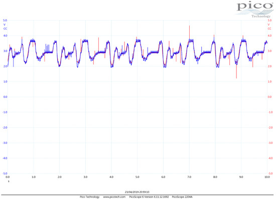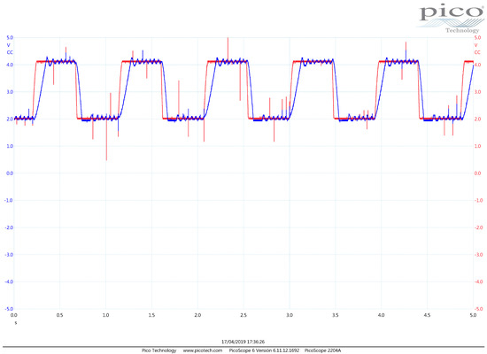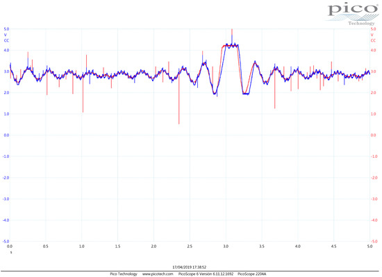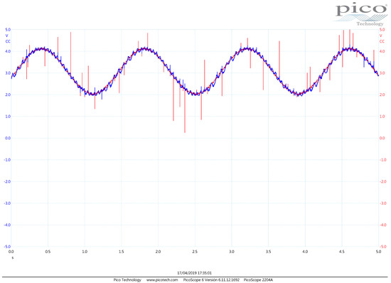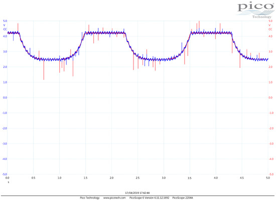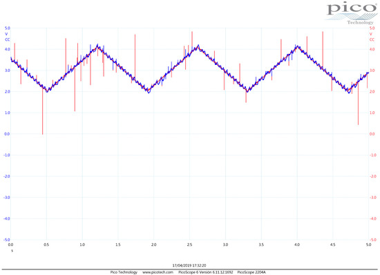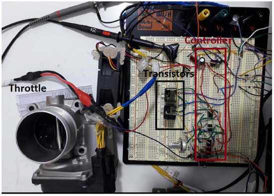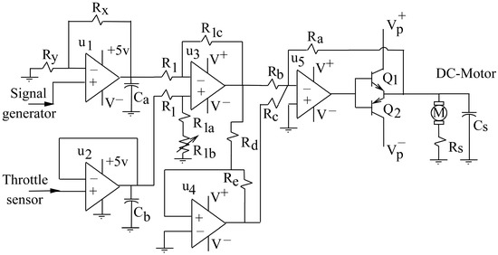 - The difference block that produces the error signal by reading the throttle sensor and the reference trajectory signal is implemented by the operational amplifier . The potentiometer in this block is employed to compensate mismatch among the resistance values. Therefore, is conceived to buffer the throttle sensor information, and is a buffer and amplifier of the user reference trajectory supplied by a signal generator device. We use the signal generator block from the PicoScope 2000 Series digital Oscilloscope (PicoScope, Cambridgeshire, UK) device, and we employ it to read other voltage signals too. Hence, the output at this operational amplifier is actually the reference trajectory utilized by the controller.