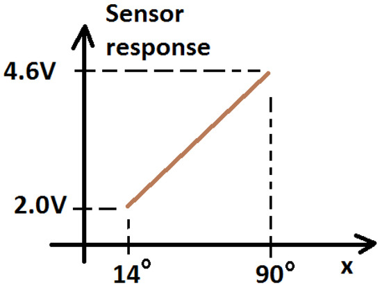 Sensor output versus throttle-plate angular position. When the throttle plate is completely open ( degrees) the sensor output voltage is 4.6 V, and when the throttle-plate is closed (at degrees), the related output is 2.0 V.