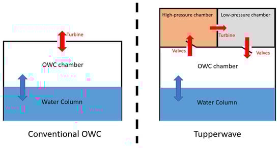 Schematic diagram of the conventional Oscillating-Water-Column (OWC) and Tupperwave device concepts.