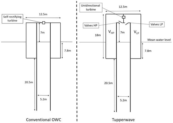 Floating devices are however more suitable because of the available buoyancy volume, which can be divided in two parts and used as the High-Pressure (HP) chamber and Low-Pressure (LP) chambers. In this article, the Tupperwave principle is applied to a floating axisymmetric structure in the form of a spar buoy. In addition to a potential yield increase due to the high efficiency of the unidirectional turbine, this principle also aims at smoothing the flow across the turbine and hence maximising its efficiency and the power quality delivered by the device. An optimization study showed that the volume of these chambers should be maximized []. Thus, the whole buoyancy volume of the chosen spar buoy was used, and each chamber was . Figure 2 displays the schematic for the Tupperwave device at full scale, as well as the corresponding conventional OWC using the same spar buoy geometry.