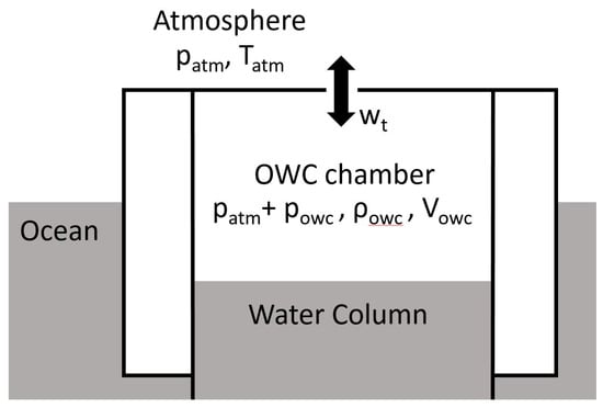 The air chamber in a conventional OWC device is commonly modelled in the literature using the linearized isentropic assumption. The main justification is that the temperature oscillations in the air chamber are relatively small and their time scales (a few seconds) are too short for significant heat exchanges to occur across the chamber walls and across the air-water interface []. It was proven in [] that the linearised isentropic assumption provides a satisfactory results for the modelling of conventional OWCs except possibly under very rough sea conditions. In this paper, the numerical model will be compared to model-scale experimental results where pressure and temperature oscillations are even smaller. The use of the linearised isentropic assumption is hence justified. Figure 3 displays a schematic of the OWC thermodynamic system.