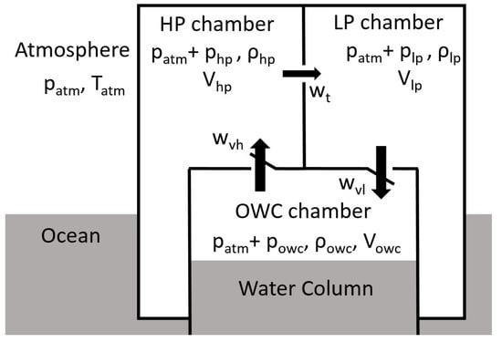 At model scale, the temperature increase is expected to be negligible. Moreover, the pressures reached in the device are expected to be in the same order as in the conventional OWC. Hence, the linearized isentropic assumption is assumed to be valid. Figure 4 displays a schematic of the three chambers, which constitute three interconnected thermodynamic systems.