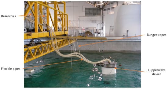 The same condition needs to be satisfied for the LP chamber. At full scale, the HP and LP chamber are . At model scale, the volumes of the chambers therefore are . Unlike full scale, it is impossible to fit both chambers on the device as their volume largely exceeds the overall volume of the device. The alternative at small scale is to locate the main volume of the HP and LP chambers outside of the device and connect them to two smaller chambers on the device with flexible pipes. Large reservoirs were used for the HP and LP chambers and located on the pedestrian bridge above the tank, see Figure 5. The flexible pipes were chosen as lightweight and flexible as possible to reduce their influence on the floating device motion. Part of the pipes’ weight was supported by bungee ropes. A similar experimental setup was implemented in [] to test a floating air bag wave energy converter at model scale.