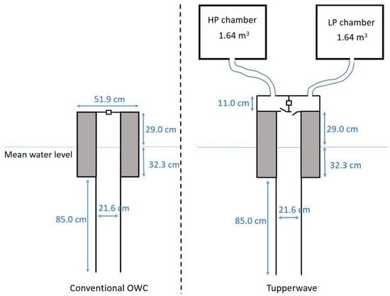 Schematic of the model scale conventional OWC and Tupperwave devices.