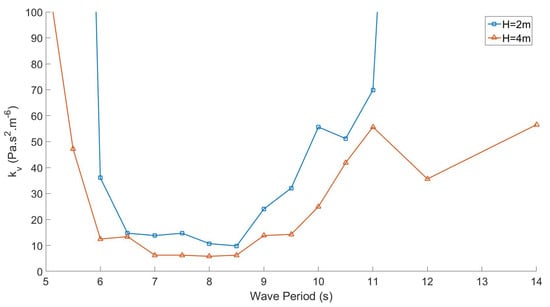 According to Equations (15) and (16), lower values of the valve damping coefficient reduce the pressure drop across the valves and hence reduce the pneumatic power losses. The value of is therefore fundamental for the device efficiency. Unlike for the orifices, the damping coefficient of the valves were experimentally assessed during each test by using Equations (15) and (16) and monitoring the pressure drop and air flow across the valves. The air flow rate across the valves was calculated from the measurement of the IWS elevation achieved with wave probes located inside the water column. Different valve damping values were obtained depending on the tests undertaken. Figure 8 displays the values of for the HP valve obtained in regular waves.